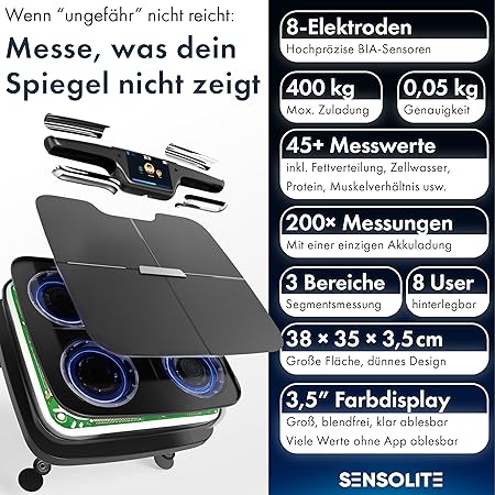 ترازو هوشمند Sensolite یک انتخاب ایده‌آل برای افرادی است که به دنبال پایش دقیق سلامت بدن و مدیریت سبک زندگی سالم هستند. این ترازو پیشرفته با بهره‌گیری از فناوری Bioelectrical Impedance (BIA) و سنسورهای دستی و پایی، داده‌های دقیق و کاربردی درباره ترکیب بدن ارائه می‌دهد.